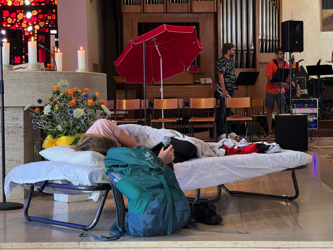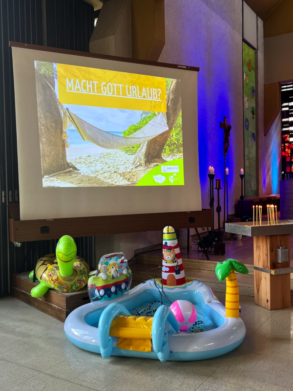 Musikalisch gestaltet wurde der Gottesdienst von der Band „Die Grusicals“. Atmosphärisch war die Kirche in eine Pool- und Strandlandschaft gestaltet, mit Planschbecken, Liegestühlen und Sonnenschirmen, und flimmerte in verschiedenen Blautönen. In dieser Atmosphäre begann der Gottesdienst mit einem kleinen Anspiel, in dem Zoe (12) schlafend im Bett lag und von Urlaub träumte. Als plötzlich der Wecker klingelte und sie aus ihren Träumen riss und ihr klar machte, dass der Schulalltag bevorsteht.