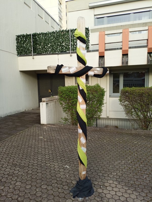 An Karfreitag haben wir uns als Gruppe von ca.35 Menschen von klein bis gross auf den Weg gemacht und haben versucht die Leidensgeschichte Jesu aus einem neuen Blickwinkel zu sehen. Mit Comic-Bildern haben wir sieben Stationen von Jesus begleitet. Die jungen Menschen haben miteinander geteilt, wo sie im Leben nicht wegschauen, sondern eingreifen wollen. Sie haben Pflaster ans Kreuz geklebt, auf denen ihre eigenen Erfahrungen mit Schmerz und Leid notiert sind.