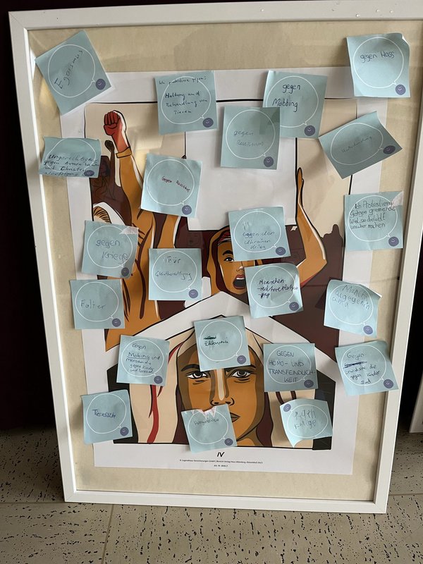 Dabei bedient sich der Jugendkreuzweg 2024 der Kunstform des Comics und der Graphic Novel, um diese Vielfalt von Gedanken, Sichtweisen und Standpunkten auszudrücken. Ähnlich den Gedanken- und Sprechblasen in Comics werden Gedanken explizit aufgeschrieben, um den individuellen Standpunkt visuell darzustellen.