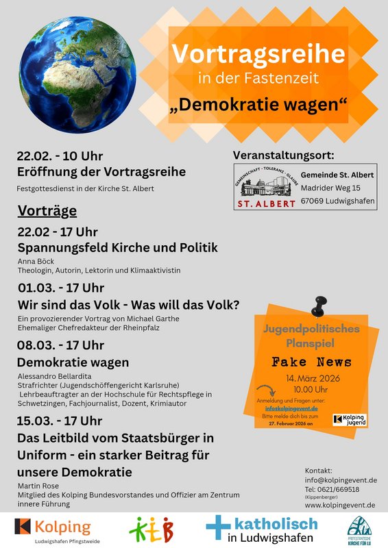 Am Nachmittag und den darauffolgenden Sonntagen lädt die Kolpingsfamilie dann zu 4 Vorträgen über das hochaktuelle Thema "Demokratie wagen" ein.