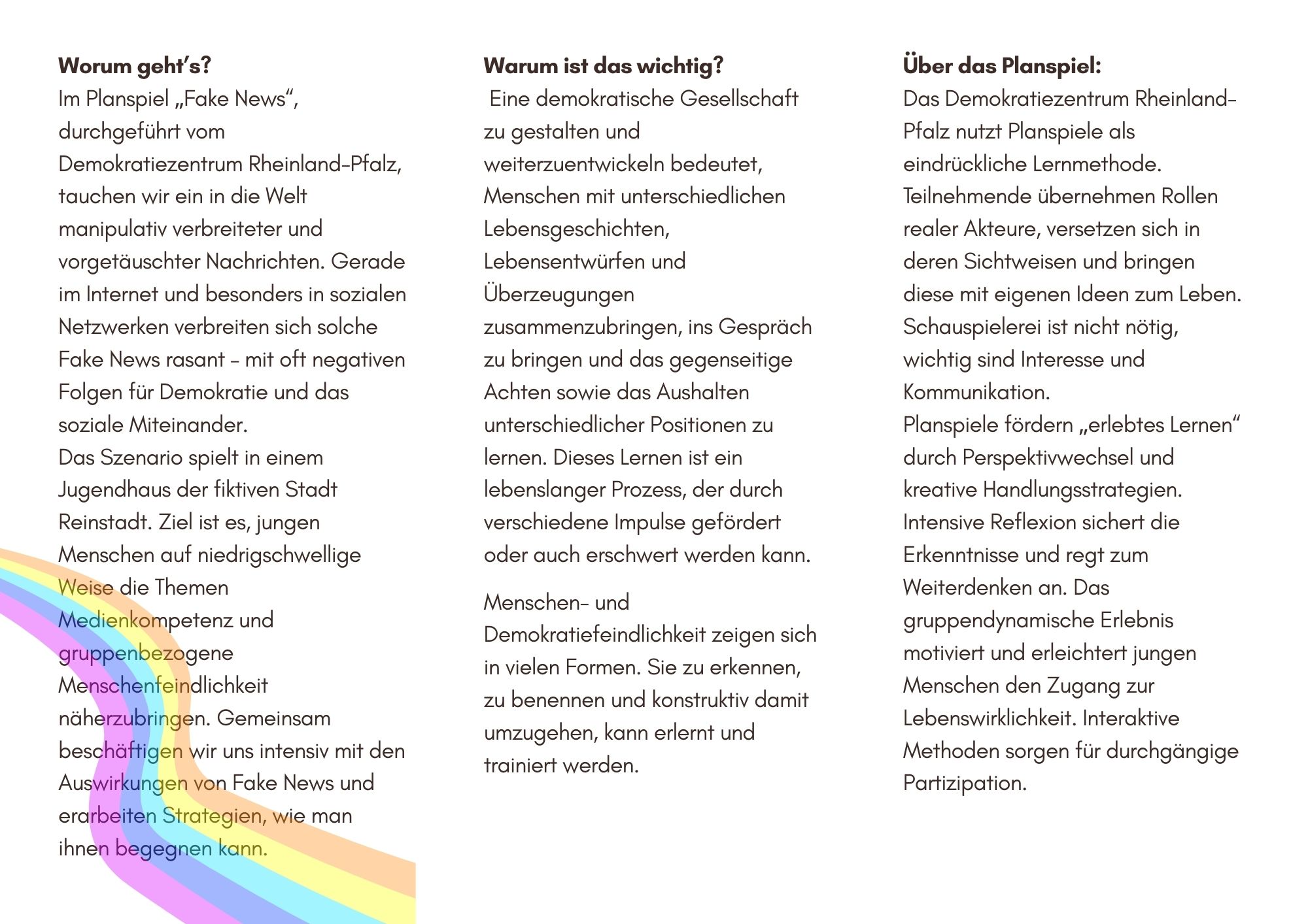 Das Demokratiezentrum Rheinland-Pfalz nutzt hierfür die besonders eindrückliche und lerneffektive Methode des Planspiels. In realitätsnahen Situationen übernehmen die Teilnehmenden die Rollen relevanter Akteurinnen und Akteure, versetzen sich in deren Sichtweisen und erwecken die Charaktere mit ihren Ideen zum Leben. Schauspielerisches Talent ist dabei keine Voraussetzung – wichtig sind Interesse am Thema und an Kommunikation.