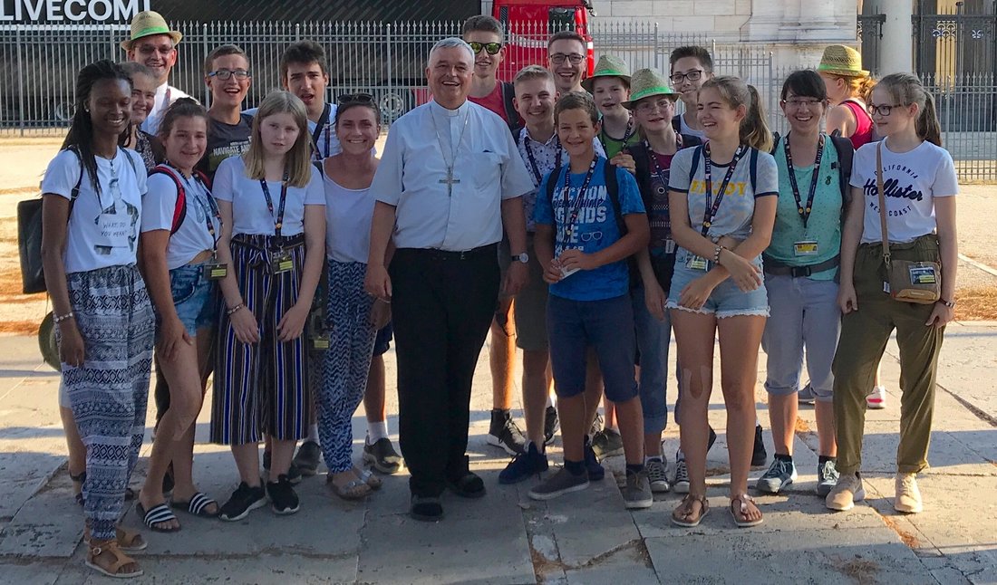 Am nächsten Vormittag feierten wir mit allen Speyerer Minis und unserem Bischof Karl-Heinz Wiesemann den Eröffnungsgottesdienst unter dem Motto „Suche Frieden und jage ihm nach“. Die vielen Minis ließen es zu einem unvergesslichen Ereignis werden. Anschließend ging es direkt zurück zum Hotel, weil wir unseren Bus nicht verpassen durften, der uns zu einer Stadtrundfahrt quer durch Rom kutschierte. Wir sahen u.a. das Forum Romanum, das antike Haupttor des alten Roms, die Hadrian- Säule, den Mund der Wahrheit, das Kolosseum und den Circus Maximus. Die Rundfahrt endete bei der Kirche St. Paul vor den Mauern. Dort war der Andrang so groß, dass das geplante offene Treffen mit unserem Bischof nach draußen verlegt werden musste. Nach einer kleinen Unterhaltung und einigen Fotos fuhren wir nach Trastevere und ließen dort den Abend gemütlich ausklingen. Überraschend erlebten wir eine Marienprozession mit anschließendem Feuerwerk mit.