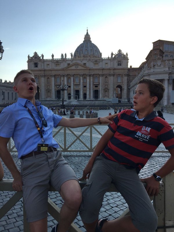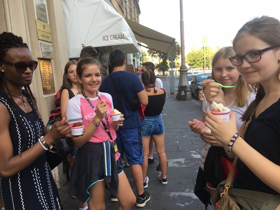Ende Juli fuhren wir, 17 Ministrantinnen und Ministranten unserer Pfarrei und unser Pfarrer, zur großen Ministrantenwallfahrt nach Rom. Als Reisegruppe 69 im Bus 8 gehörten wir zu 1000 Minis aus unserer Diözese. Abends um 19.00 Uhr ging es endlich los. Nach 18 Stunden Fahrzeit und etlichen Pausen kamen wir gegen Mittag in der Ewigen Stadt an. Unser riesiges Hotel war voll nur mit Minis! Nach einem kurzen Mittagessen zogen wir los, um die letzten Wochentickets für den Nahverkehr zu ergattern. Der Andrang und die begrenzte Anzahl der Tickets trieben uns zu solch einer Eile. Nun hatten wir Zeit, unser erstes Eis zu genießen. Auf dem Petersplatz verbrachten wir dann den restlichen Abend.