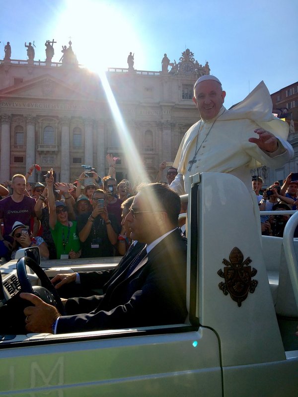 Am späten Nachmittag war dann die große Papstaudienz. Wir ergatterten noch Sitzplätze und warteten, der glühenden Sonne ausgesetzt, zwei Stunden auf den Papst. Die Feuerwehr kühlte die wartende Menge mit Wasserwerfern ab. Leider waren wir zu weit vorne, um geduscht zu werden. Als der Papst dann schließlich fröhlich winkend auf seinem Papamobil durch die Menge fuhr, kam er direkt an uns vorbei! Fast hätten wir ihm die Hand schütteln können. Er feierte mit uns eine Vesper. Dies war ein unvergesslicher Abend und das größte Highlight unserer Romwallfahrt!
