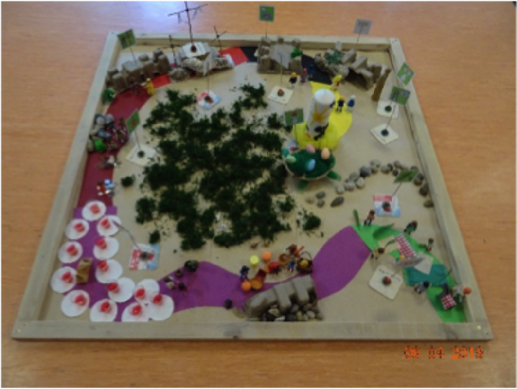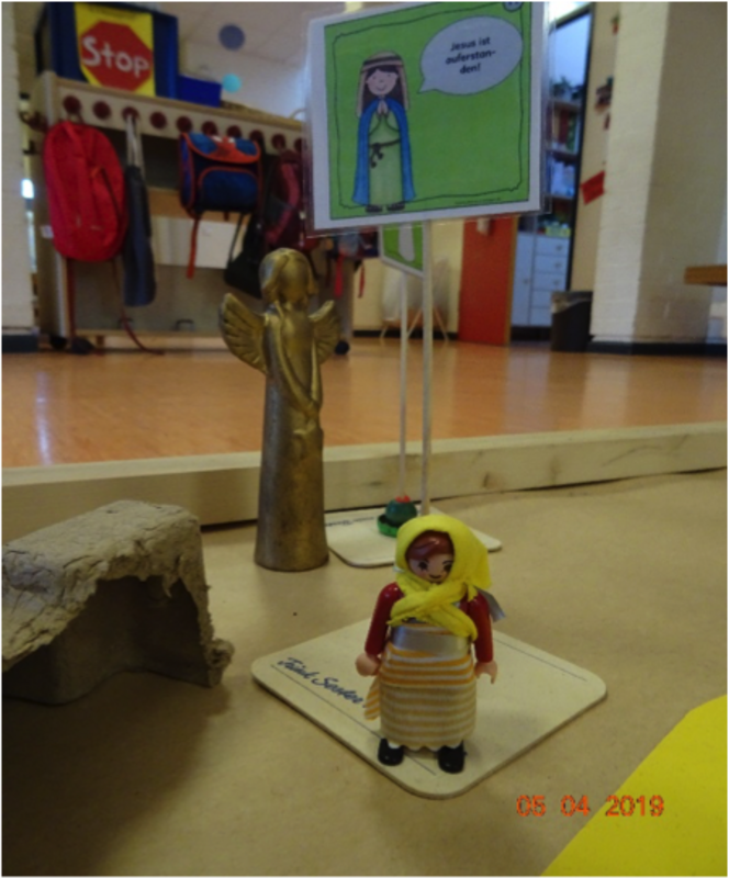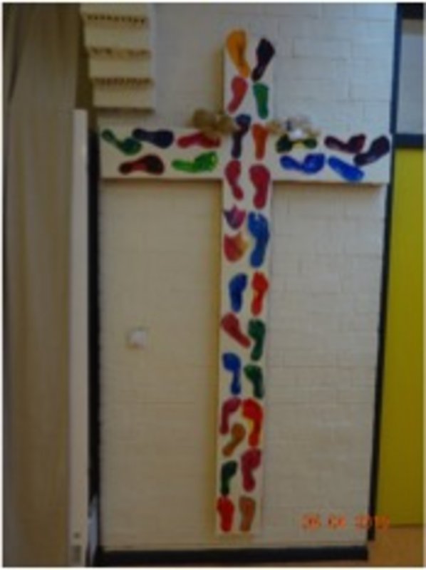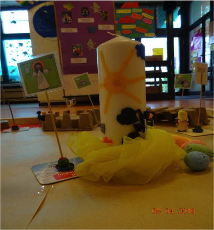 Nachdem wir die Fastenzeit genauer kennen gelernt hatten, wollten wir mit Jesus ein Stück seines Weges weiter gehen. Hierbei durften sich die Kinder aus dem Buch „Elias feiert Ostern“ ihre Lieblingsgeschichten aussuchen. Diese spielten wir in improvisierten kleinen Theaterstücken nach. Zu jeder Geschichte gestalteten wir einen Bilderrahmen. In der Woche vor Karfreitag feierten wir auf Wunsch der Kinder wieder „Das letzte Abendmahl“. Als Symbol für unseren langen Weg bis Ostern bastelten alle interessierten Kinder selbst ihren Fußabdruck. Diese hängten wir zusammen mit den Geschichten im Gang und am Kreuz auf. Unser Weg führte uns bis zur Auferstehung Jesu. Hierzu gestalteten wir nach Ostern mit den Kindern eine eigene Osterkerze, welche wir dann mit den Elementen ihrer Lieblingsgeschichten dekorierten.