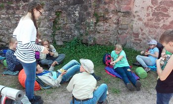 Unser Ziel war aber noch lange nicht erreicht und schon mussten wir alle wieder unsere schweren Rucksäcke aufziehen und weiter los ziehen. Nach einiger Zeit wurden unsere Beine immer schwerer und die Rucksäcke bereiteten uns große Rückenschmerzen. Der Weg wurde immer schmaler und steiler und war oft mit Baumstämmen versperrt. Irgendwie hatten wir uns verlaufen. Trotzdem verloren wir nicht unser Ziel aus den Augen. Wir liefen viele schwere, schmale und gefährliche Wege entlang. Dann schließlich, nach langem Hin und Her und weil es begann dunkel zu werden, beschlossen wir, uns eine andere Bleibe zu suchen. Wir schauten auf der Landkarte nach, wo wir in der Nähe etwas Geeignetes zum Schlafen finden konnten. Nach etwa einem halben Kilometer erreichten wir endlich eine Burgruine. Doch plötzlich bemerkten wir, dass diese Ruine für uns neun Jupfis und zwei Leiter viel zu klein war, also liefen wir einmal um die Ruine herum und fanden in der Nähe einen geeigneten Platz um zwei Planen spannen zu können. Nachdem wir mit dem Aufbau fertig waren, suchten wir Brennholz um uns ein Lagerfeuer zu machen. Wir hatten alle riesigen Spaß im Wald herumzulaufen und Stöcke zu suchen. Denn es war gar nicht so einfach Stöcke zu finden, die wenigstens halbwegs trocken waren. Zum Abendessen gab es Instant-Nudeln. Wir saßen alle zusammen am Lagerfeuer und genossen die Wärme des Feuers und die warmen Nudeln. Schließlich waren wir alle sehr müde und beschlossen, uns bettfertig zu machen. Nun lagen wir alle unter der Plane und erzählten noch miteinander, spielten Karten oder alberten herum. Wir hatten sehr viel Spaß! Am nächsten Morgen gab es Frühstück und danach packten wir unsere Sachen wieder ein und bauten die Plane ab. Danach hieß es wieder Rucksäcke auf und ab nach Hause! An der Hardenburg beschlossen wir, noch ein letztes Mal Rast zu machen. Anschließend wanderten wir schnurstracks durch den Wald nach Bad Dürkheim zurück. Zur Belohnung gab es in der Stadt noch ein Eis für alle, worüber wir uns sehr gefreut haben.