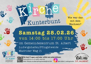 Bereits zum vierten Mal lädt die Gemeinde St. Albert herzlich zur Kirche Kunterbunt ein – und gleichzeitig ist es die erste Veranstaltung im Jahr 2026. Am Samstag, 28. Februar 2026, wird das Gemeindezentrum St. Albert wieder zu einem bunten Ort voller Leben, Kreativität und Begegnung.