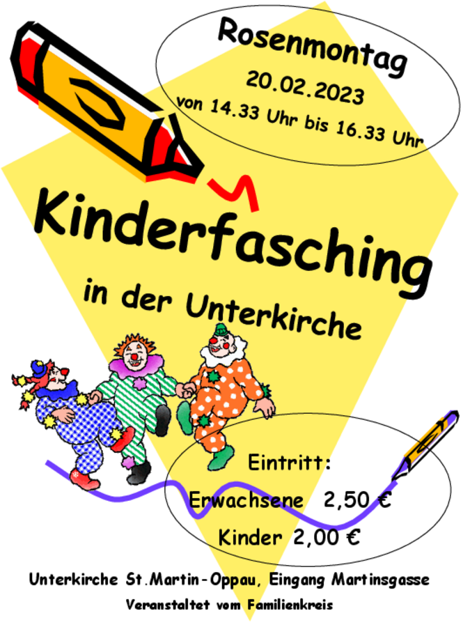 Am Rosenmontag findet von 14.33 Uhr bis 16.33 Uhr in der Unterkirche von St. Martin der traditionelle Kinderfasching statt.