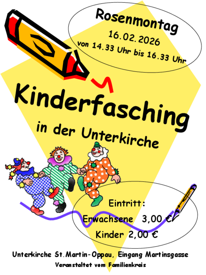 Am Rosenmontag findet von 14.33 Uhr bis 16.33 Uhr in der Unterkirche von St. Martin der traditionelle Kinderfasching statt.