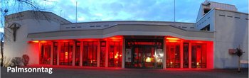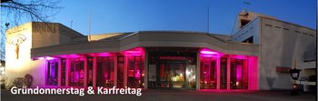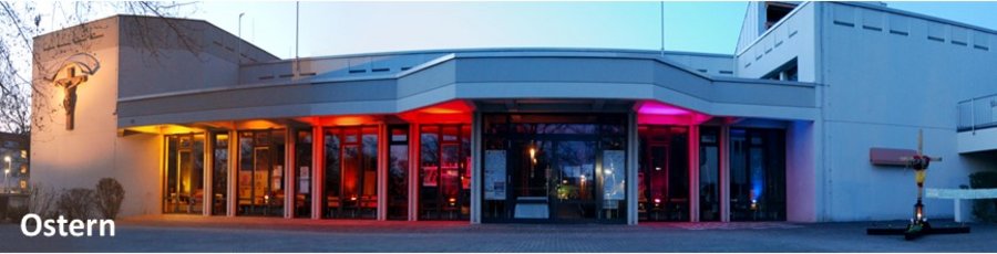 In St. Albert wurde in der Karwoche und zu Ostern passend zu dem jeweiligen Tag das Kreuz auf dem Kirchplatz gestaltet und die Fenster des Kirchenfoyers beleuchtet.