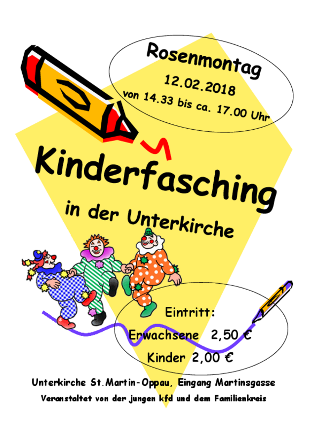 Am Rosenmontag findet von 14.33 Uhr bis 17.00 Uhr in der Unterkirche von St. Martin der traditionelle Kinderfasching statt.